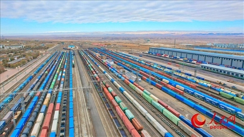 阿拉山口站編組場內(nèi)停靠著待發(fā)的中歐班列及其他出入境貨物列車。人民網(wǎng) 李欣洋攝