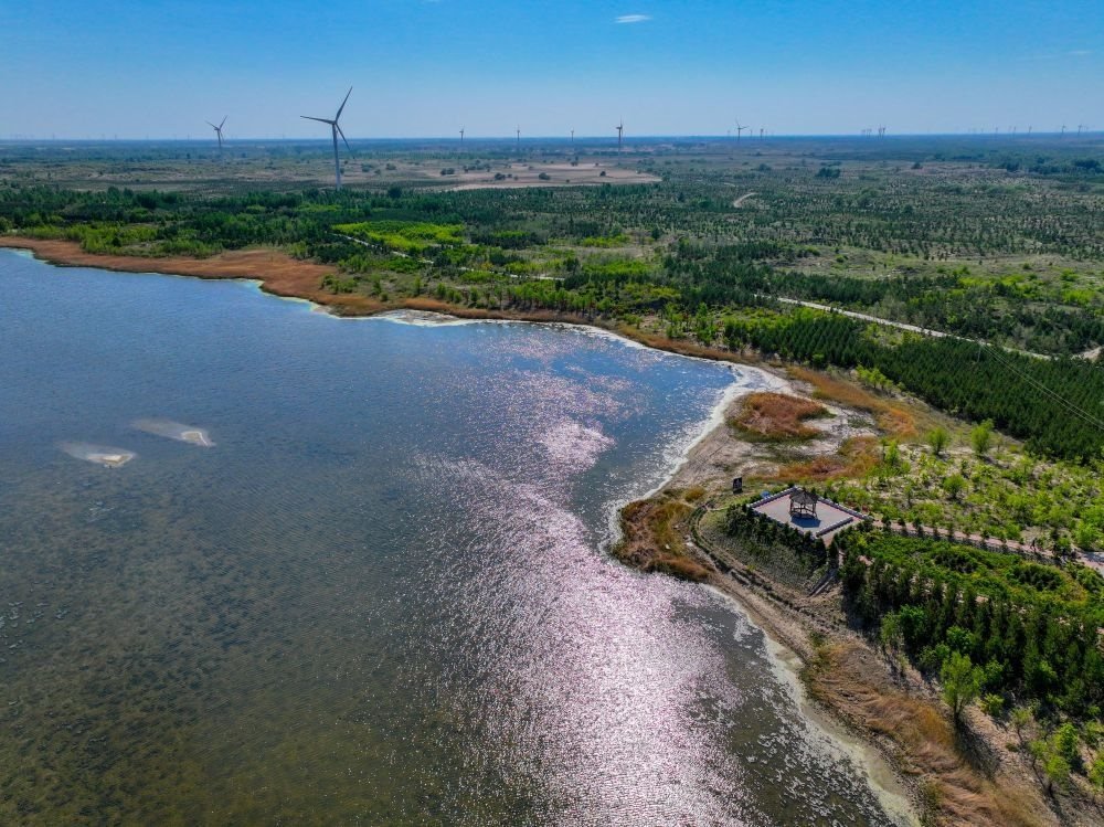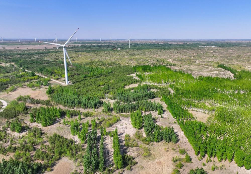 ?這是在內(nèi)蒙古通遼市科爾沁沙地“雙百萬畝”綜合治理工程努古斯臺(tái)項(xiàng)目區(qū)拍攝的風(fēng)力發(fā)電機(jī)組(2024年5月15日攝,無人機(jī)照片)。新華社記者 連振 攝