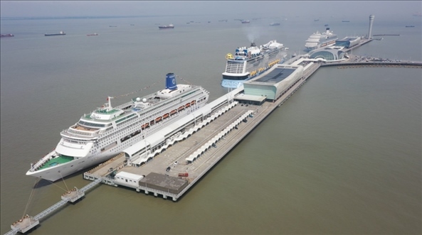 5月22日,“愛達(dá)·魔都號(hào)”“海洋光譜號(hào)”和“鼓浪嶼號(hào)”三艘郵輪??吭趨卿量趪H郵輪港(無人機(jī)照片)。(上海邊檢總站供圖)