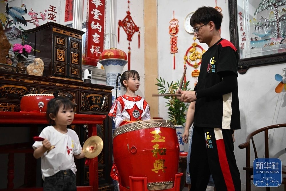 5月29日,在汕頭市貴嶼鎮(zhèn)玉窖村的家中,父親莊镕強(右)指導莊恩琪(中)和妹妹莊雅琪練習“敲鑼打鼓”。