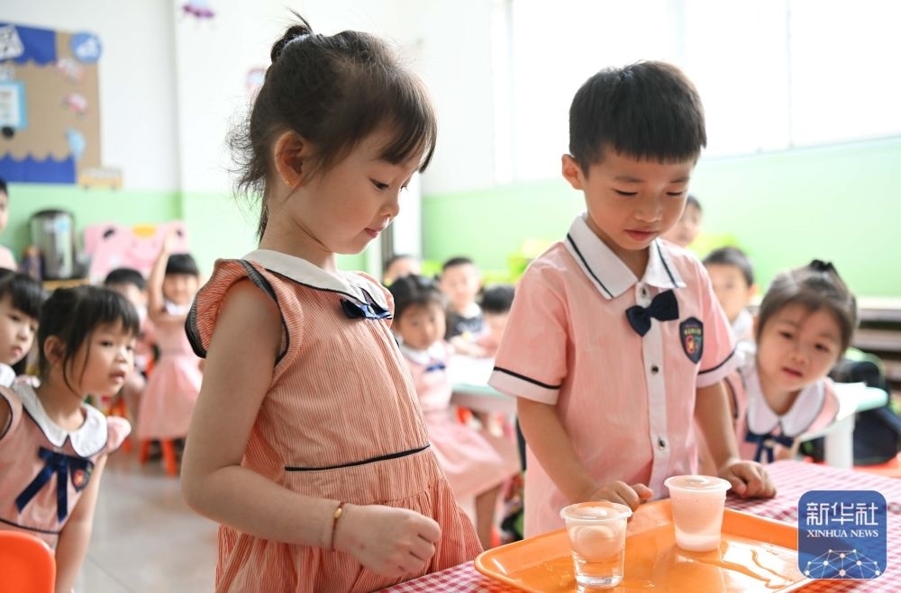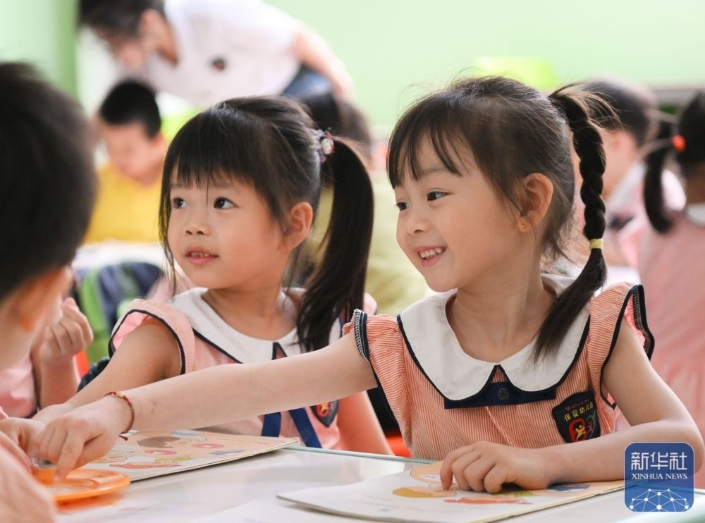 5月29日,在汕頭市貴嶼鎮(zhèn)北林保嬰幼兒園,莊恩琪(右)和同學在課堂上。