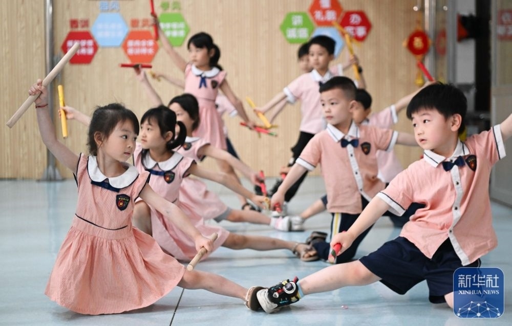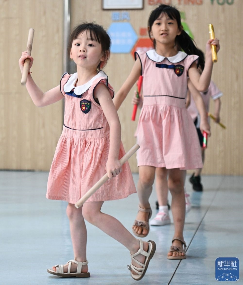 5月29日,在汕頭市貴嶼鎮(zhèn)北林保嬰幼兒園,莊恩琪(前左)在練習跳英歌舞。