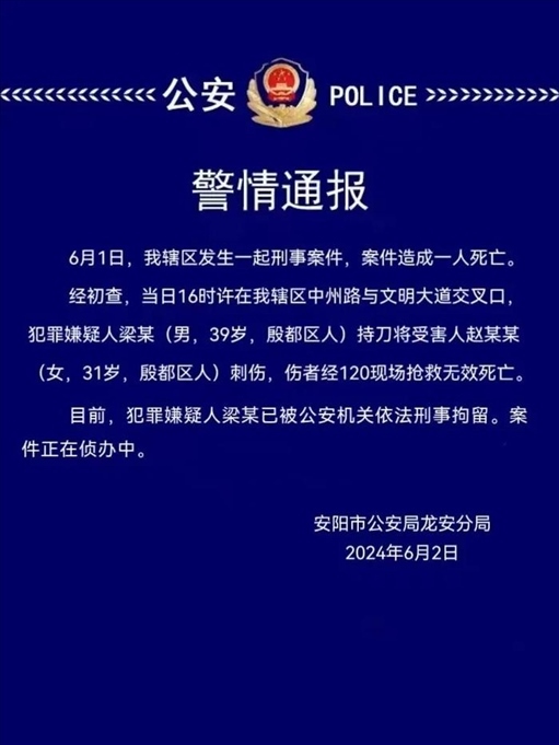 ·河南安陽(yáng)警方:一男子持刀將女子刺傷致死被刑拘。