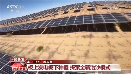 總臺記者 李欣蔓:治沙的腳步不但沒有停,還在不斷探索新的治沙模式?,F(xiàn)在我們看到的是鄂爾多斯一個已經(jīng)建好、并網(wǎng)發(fā)電的光伏項(xiàng)目,板上發(fā)電,板下種植,一個空間全方位利用。三重防線,構(gòu)建起了全新的生態(tài)治沙模式。有一個數(shù)據(jù)值得我們關(guān)注,這里的光伏項(xiàng)目占地39萬畝,與此同時(shí),生態(tài)治理面積也將規(guī)劃完成39萬畝。在國家推進(jìn)光伏治沙項(xiàng)目開發(fā)建設(shè)的進(jìn)程中,我們看到越來越多的企業(yè)參與其中,在發(fā)展新能源產(chǎn)業(yè)的同時(shí)共同擔(dān)負(fù)起治沙的責(zé)任,為一片藍(lán)海,一片綠洲的建設(shè),貢獻(xiàn)更多的力量。