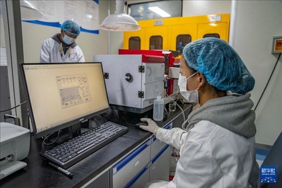 ?在聶榮縣嘎確生態(tài)畜牧業(yè)發(fā)展有限責(zé)任公司,檢驗員達(dá)娃卓瑪在檢測奶制品(5月13日攝)。新華社記者 孫非 攝