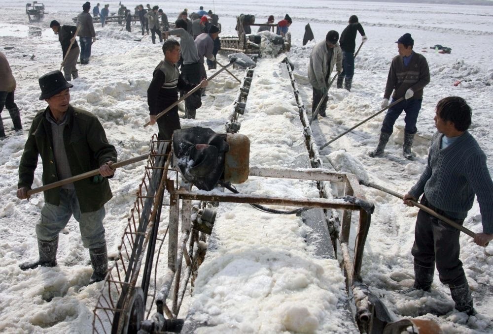 2009年2月11日,鏟硝工人在運(yùn)城鹽湖鏟收芒硝。