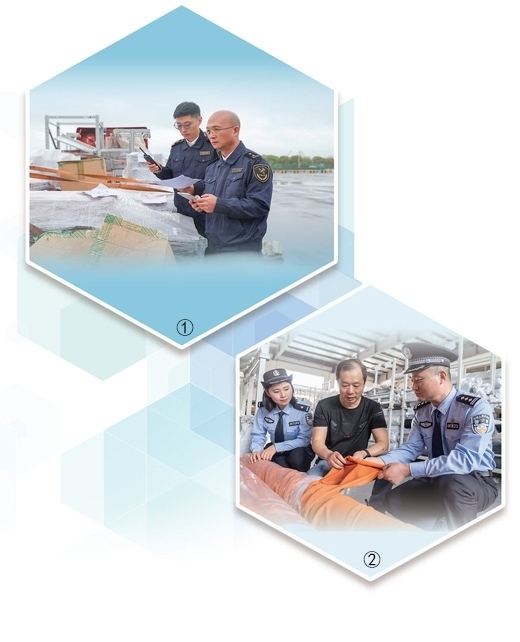 圖①:上海海關所屬松江海關工作人員檢查貨物。上海海關致力打造通關手續(xù)更簡便、通關效率更快捷、監(jiān)管更嚴密有效的營商環(huán)境。姜輝輝攝(人民視覺) 圖②:江蘇南通通州區(qū)公安局西亭派出所民警走進生產車間,了解企業(yè)情況,護航企業(yè)經營發(fā)展。翟慧勇攝(人民視覺)
