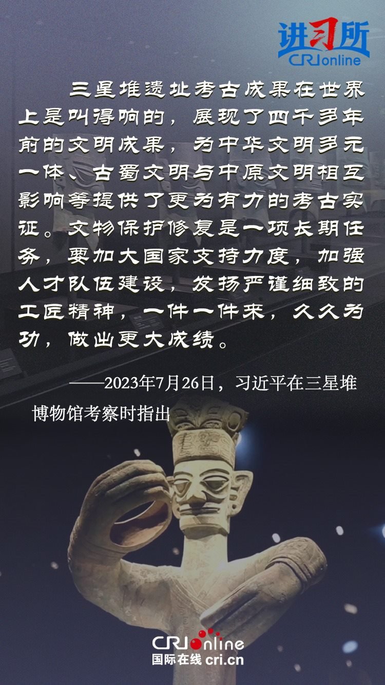 文物和文化遺產(chǎn)承載燦爛文明,傳承歷史文化,維系民族精神。三星堆博物館、殷墟遺址、敦煌研究院……這些年,習(xí)近平高度重視中華文明探源工程和文物保護工作,強調(diào)要把中華文明歷史引向深入,把中華優(yōu)秀傳統(tǒng)文化一代一代傳下去。