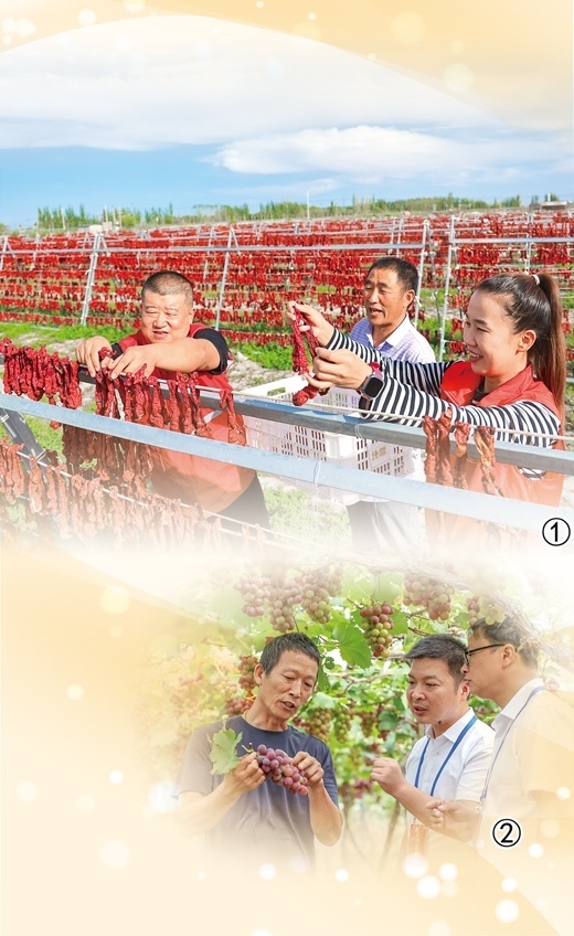 圖①:新疆維吾爾自治區(qū)博湖縣塔溫覺肯鄉(xiāng)辣椒曬場(chǎng)上,黨員志愿服務(wù)隊(duì)幫助村民晾曬辣椒。年 磊攝 圖②:浙江省淳安縣紀(jì)檢監(jiān)察干部走訪果農(nóng),聽取意見建議。謝航凱攝