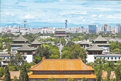 8月12日,從景山上沿北京中軸線向北眺望鼓樓。 新華社記者 李 鑫攝