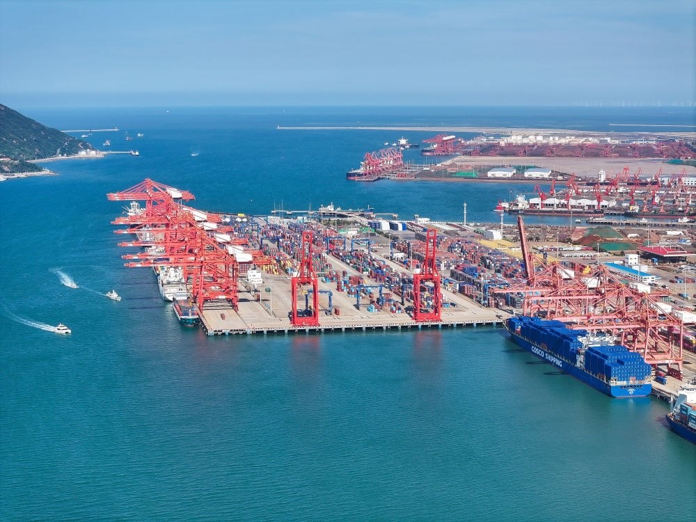 貨輪停靠在連云港港集裝箱碼頭(2024年6月26日攝,無人機照片)。