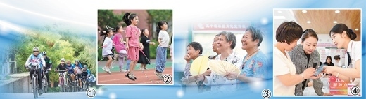 圖①:河北邯鄲市復(fù)興區(qū)沁河源景區(qū),騎行愛好者在騎行。聶長青攝 圖②:河南洛陽市瀍河回族區(qū)君河灣小學(xué),暑期托管班的學(xué)生在跳繩。李衛(wèi)超攝 圖③:安徽合肥市蜀山區(qū)小廟鎮(zhèn)五十墩社區(qū)文化廣場(chǎng),村民在看戲曲演出。陳三虎攝 圖④:內(nèi)蒙古鄂爾多斯市康巴什區(qū)寧馨社區(qū)政務(wù)便民服務(wù)站,工作人員幫居民辦業(yè)務(wù)。王 正攝
