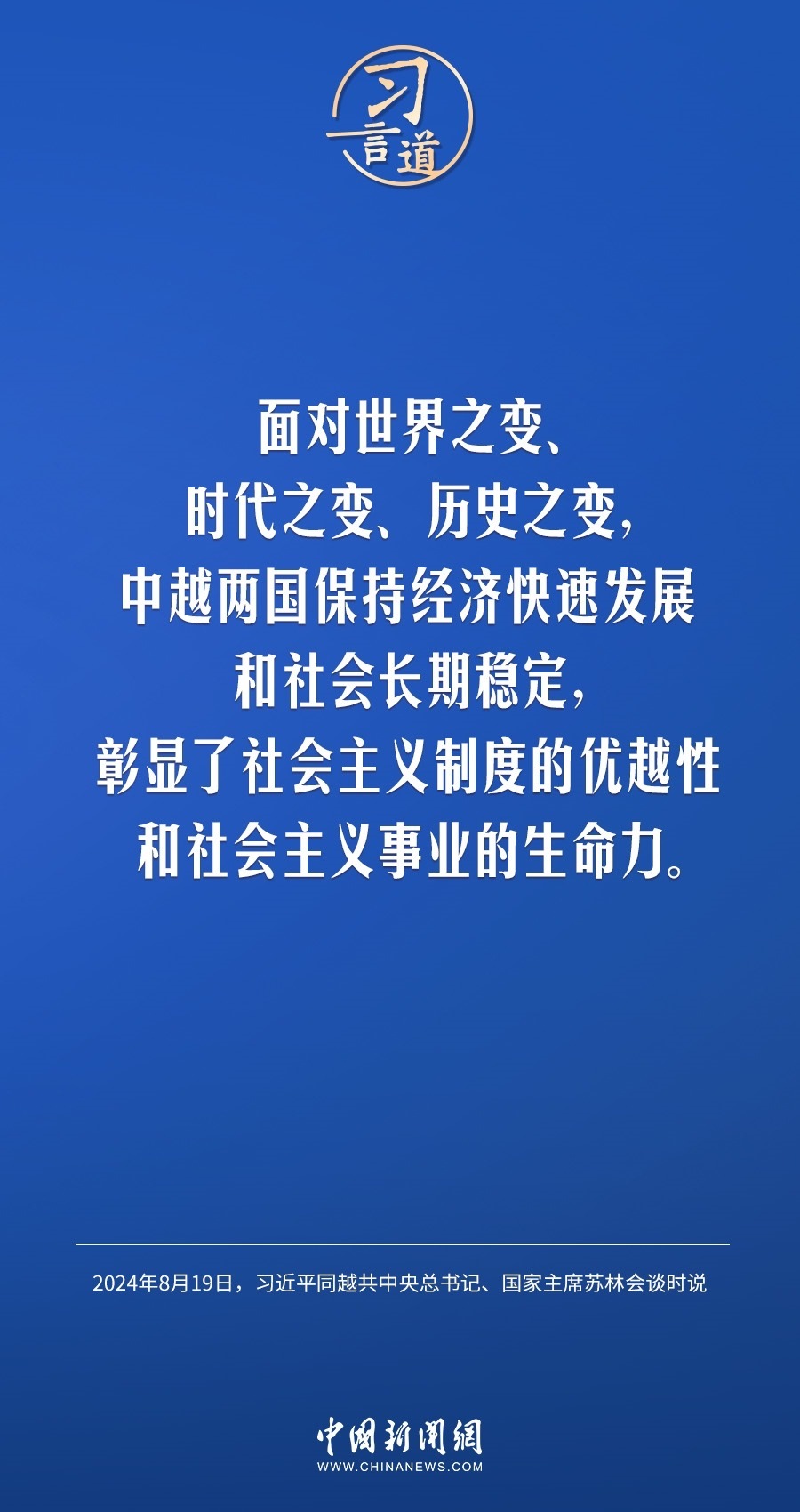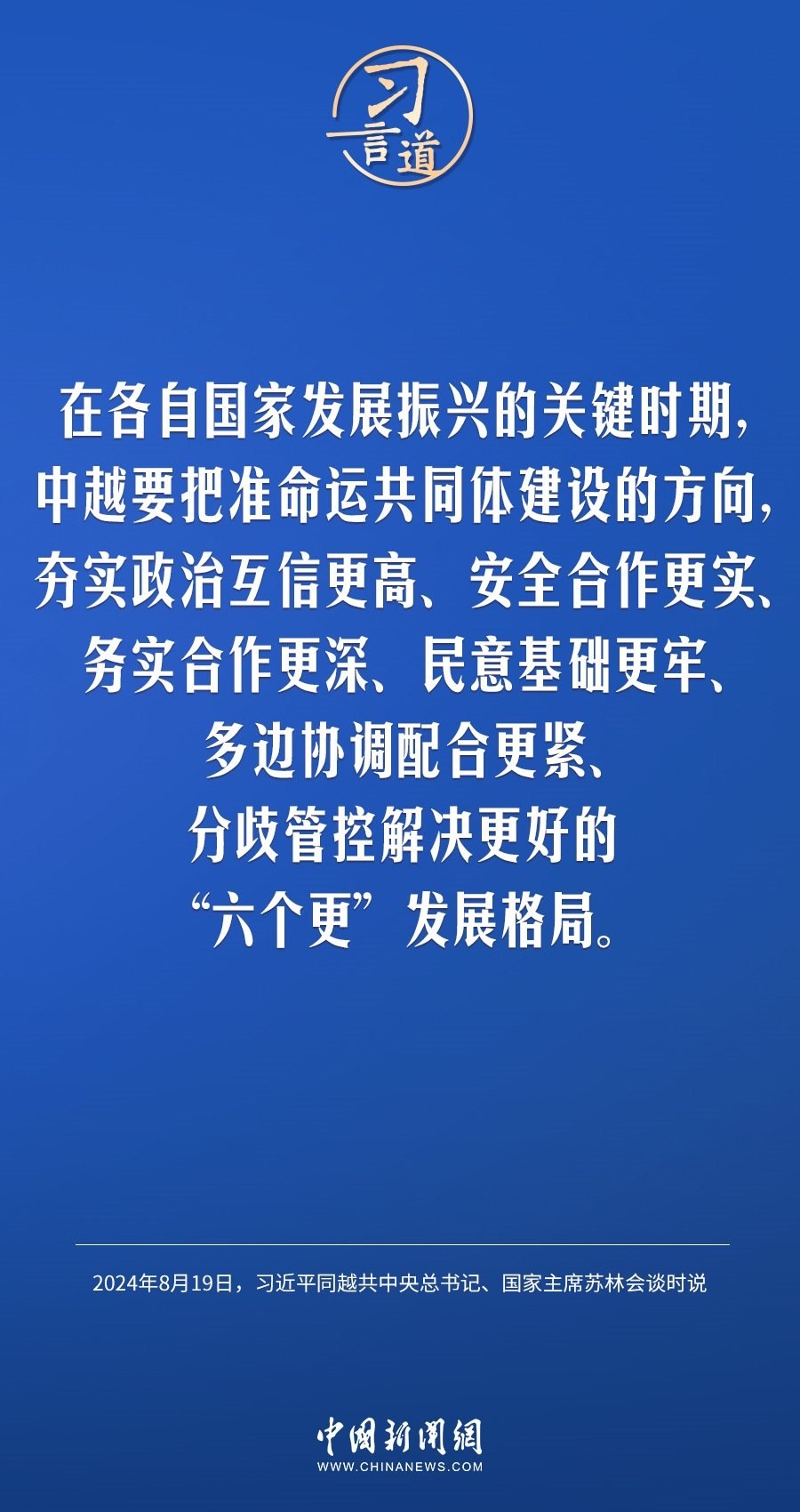 8月19日,中共中央總書(shū)記、國(guó)家主席習(xí)近平在北京人民大會(huì)堂同來(lái)華進(jìn)行國(guó)事訪問(wèn)的越共中央總書(shū)記、國(guó)家主席蘇林舉行會(huì)談。習(xí)近平指出——