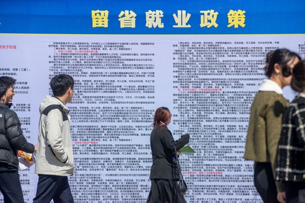 2024年4月9日,求職者在黑龍江省民辦高校就業(yè)協(xié)作體2024屆聯(lián)合招聘會(huì)現(xiàn)場(chǎng)瀏覽留省就業(yè)政策。