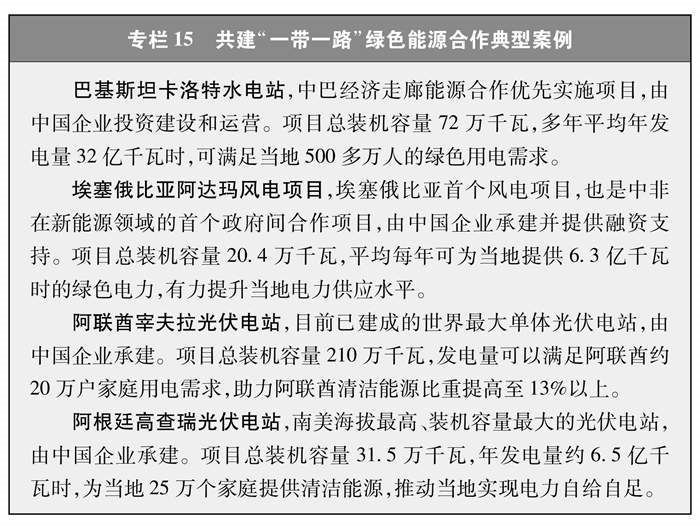 持續(xù)推動“一帶一路”綠色能源合作。中國發(fā)布《關(guān)于推進(jìn)共建“一帶一路”綠色發(fā)展的意見》等政策文件,與共建“一帶一路”國家積極拓展綠色能源領(lǐng)域合作。2021年,中國宣布不再新建境外煤電項(xiàng)目,綠色低碳能源已成為中國在共建國家能源合作重點(diǎn)。中國與100多個國家和地區(qū)開展綠色能源項(xiàng)目合作,一大批標(biāo)志性能源項(xiàng)目和惠民生的“小而美”項(xiàng)目落地生根,有效解決了所在國用電難、用電貴等問題,為所在國提供了清潔、安全、可靠的能源供應(yīng)方案。