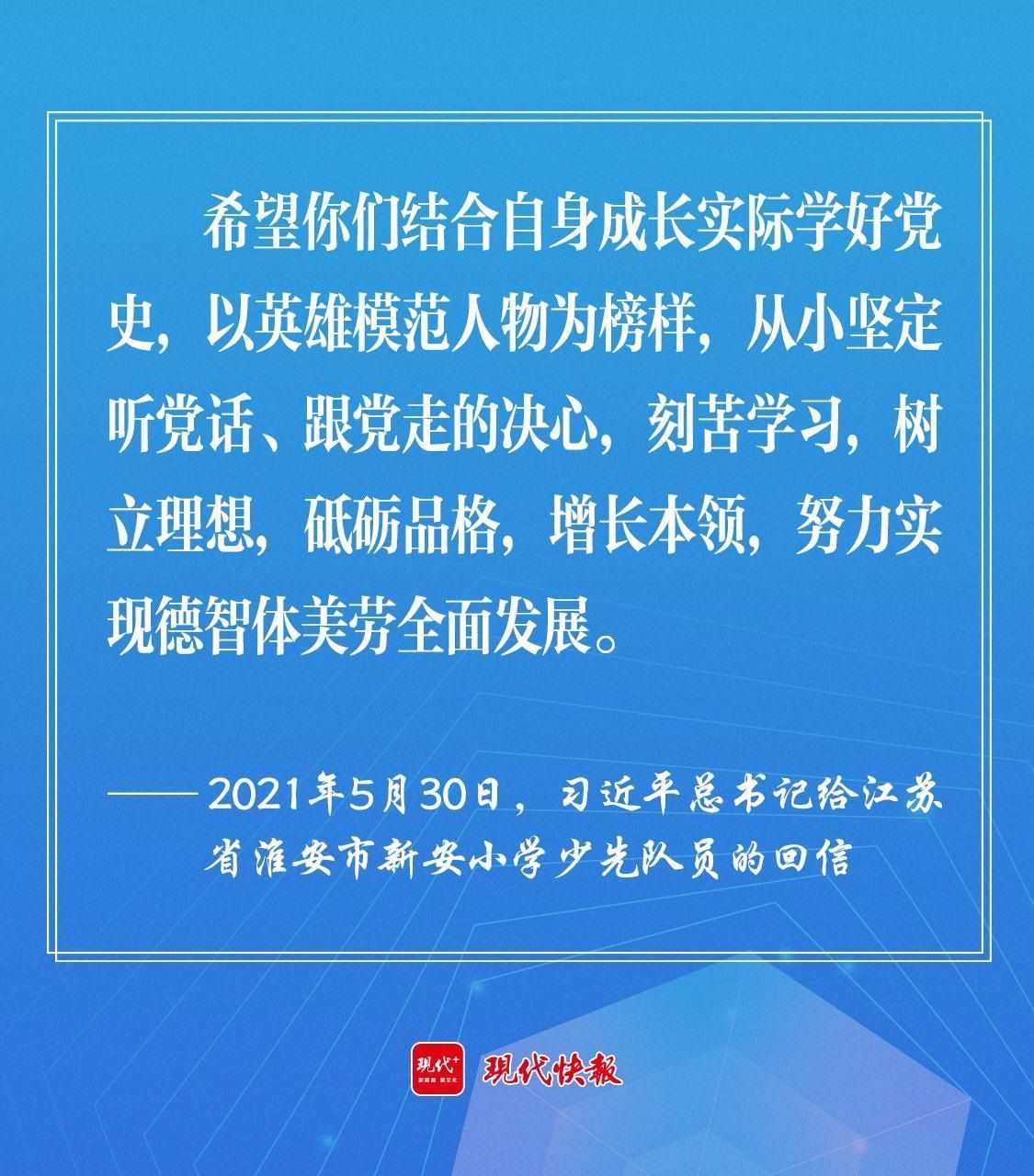 2021年5月30日,習(xí)近平總書記給江蘇省淮安市新安小學(xué)少先隊員回信時強調(diào),“希望你們結(jié)合自身成長實際學(xué)好黨史,以英雄模范人物為榜樣,從小堅定聽黨話、跟黨走的決心,刻苦學(xué)習(xí),樹立理想,砥礪品格,增長本領(lǐng),努力實現(xiàn)德智體美勞全面發(fā)展?!?/p>