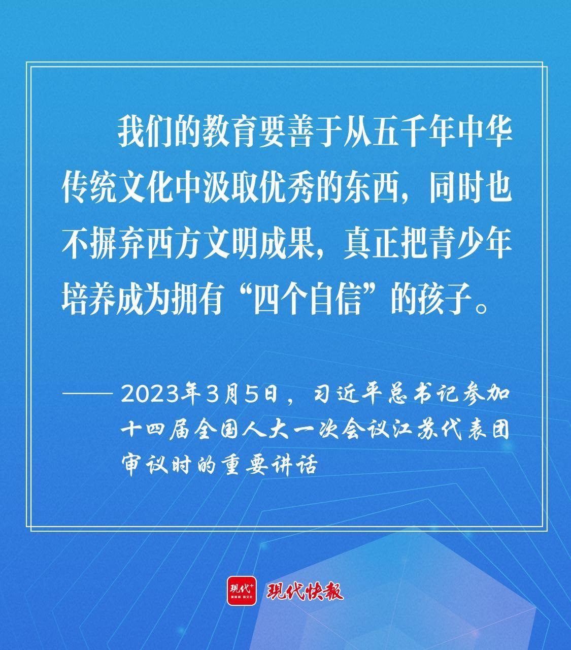 2023年3月5日,習(xí)近平總書記參加十四屆全國人大一次會議江蘇代表團審議時,勉勵教育工作者“要善于從五千年中華傳統(tǒng)文化中汲取優(yōu)秀的東西,同時也不摒棄西方文明成果,真正把青少年培養(yǎng)成為擁有‘四個自信’的孩子。”