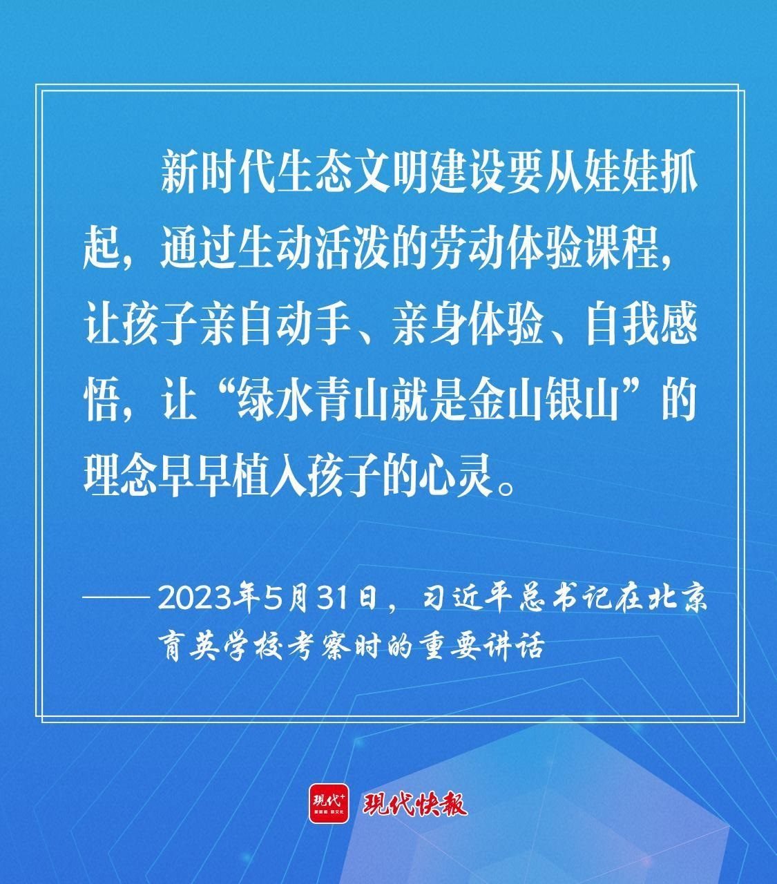 2023年5月,習(xí)近平總書記在北京育英學(xué)??疾鞎r強調(diào),新時代生態(tài)文明建設(shè)要從娃娃抓起,通過生動活潑的勞動體驗課程,讓孩子親自動手、親身體驗、自我感悟,讓“綠水青山就是金山銀山”的理念早早植入孩子的心靈。