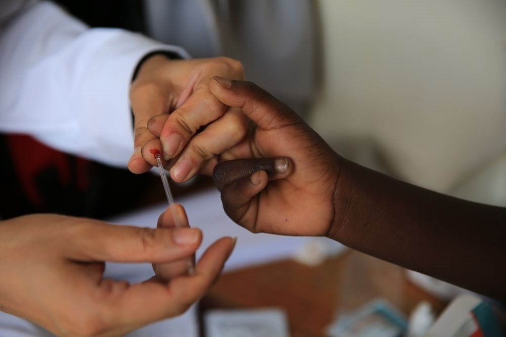 2018年12月8日,在馬拉維南部布蘭太爾市卡迪迪村衛(wèi)生院,第六批中國援馬拉維醫(yī)療隊醫(yī)生在義診活動中為當?shù)鼐用駲z測瘧疾。