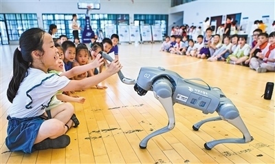 安徽省安慶市科普大篷車巡展活動(dòng)走進(jìn)岳西縣菖蒲鎮(zhèn)中心學(xué)校。圖為學(xué)生與機(jī)器狗互動(dòng)。王先國(guó)攝(影像中國(guó))