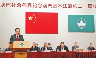 2013年2月21日,吳邦國(guó)同志在澳門(mén)文化中心出席澳門(mén)社會(huì)各界紀(jì)念澳門(mén)基本法頒布20周年啟動(dòng)大會(huì)并發(fā)表講話。新華社記者 鞠 鵬攝