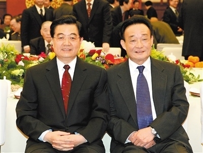 二〇〇五年一月一日,全國(guó)政協(xié)在北京舉行新年茶話會(huì)。這是胡錦濤同志與吳邦國(guó)同志在一起。新華社記者 樊如鈞攝