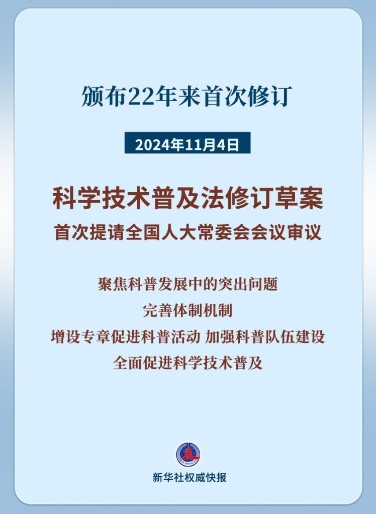 科學(xué)技術(shù)普及是實現(xiàn)創(chuàng)新發(fā)展的重要基礎(chǔ)性工作。11月4日,科學(xué)技術(shù)普及法修訂草案首次提請全國人大常委會會議審議,這是科學(xué)技術(shù)普及法自2002年公布施行以來首次修訂。