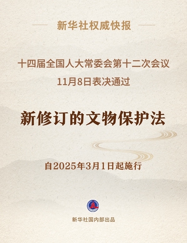 十四屆全國人大常委會第十二次會議11月8日表決通過新修訂的文物保護(hù)法,自2025年3月1日起施行。
