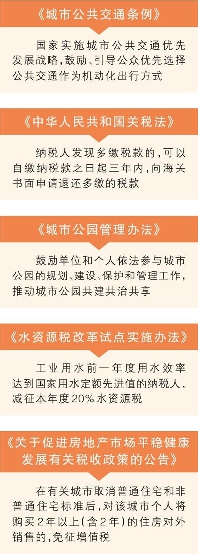編者按:鼓勵、引導公眾優(yōu)先選擇公共交通作為機動化出行方式;保持現(xiàn)行關稅稅制基本穩(wěn)定;鼓勵單位和個人參與城市公園的規(guī)劃、建設、管理……12月起,《城市公共交通條例》《中華人民共和國關稅法》《城市公園管理辦法》等一批法律法規(guī)正式施行,切實以法治力量推動經濟社會高質量發(fā)展。