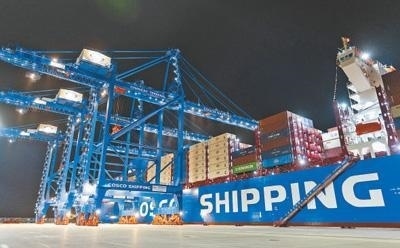 軟聯(lián)通共建“一帶一路”國家在工作制度對接、技術(shù)標(biāo)準(zhǔn)協(xié)調(diào)、檢驗結(jié)果互認(rèn)等方面強(qiáng)化合作、統(tǒng)一標(biāo)準(zhǔn),貿(mào)易自由化便利化水平不斷提升。上海洋山港海關(guān)對接共建國家進(jìn)出口貨物相關(guān)標(biāo)準(zhǔn),推動通關(guān)一體化方式申報,提升通關(guān)效率。圖為無人駕駛的全自動導(dǎo)引車在洋山港穿梭往來,搬運(yùn)集裝箱。王 初攝(影像中國)