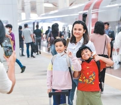 硬聯(lián)通雅萬高鐵是我國在境外完成全過程勘察設(shè)計建設(shè)的首個高鐵項目,于去年10月17日正式開通運(yùn)營,是中印尼共建“一帶一路”合作的典范。圖為乘客在和雅萬高鐵動車組合影留念。新華社記者 徐 欽攝