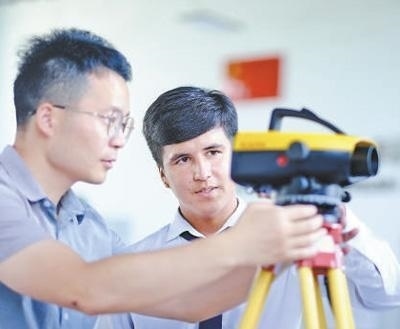 心聯(lián)通在塔吉克斯坦首都杜尚別的魯班工坊,來自天津城市建設(shè)管理職業(yè)技術(shù)學(xué)院的老師(左)為當(dāng)?shù)貙W(xué)生提供指導(dǎo)。新華社記者 鄭開君攝
