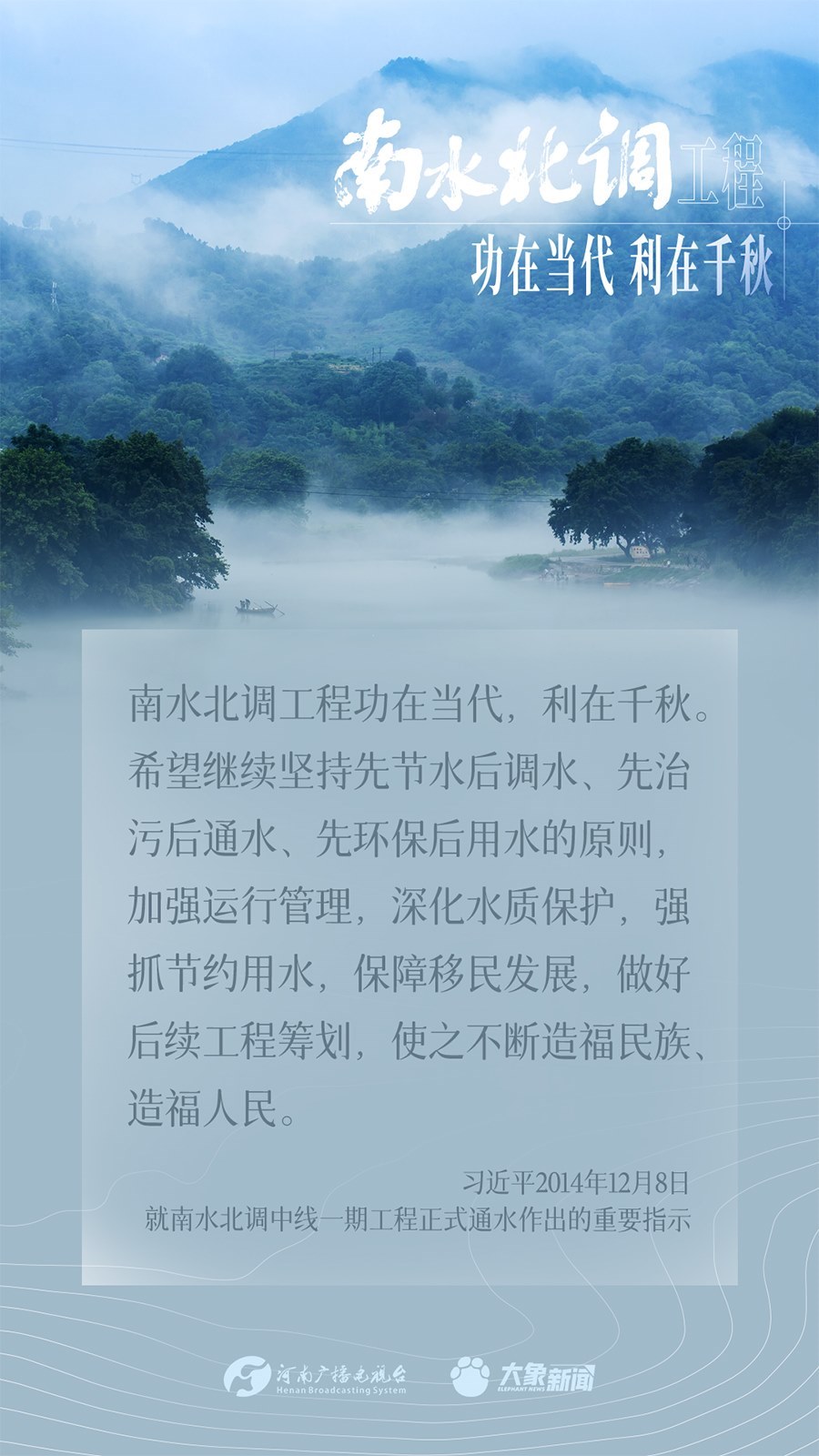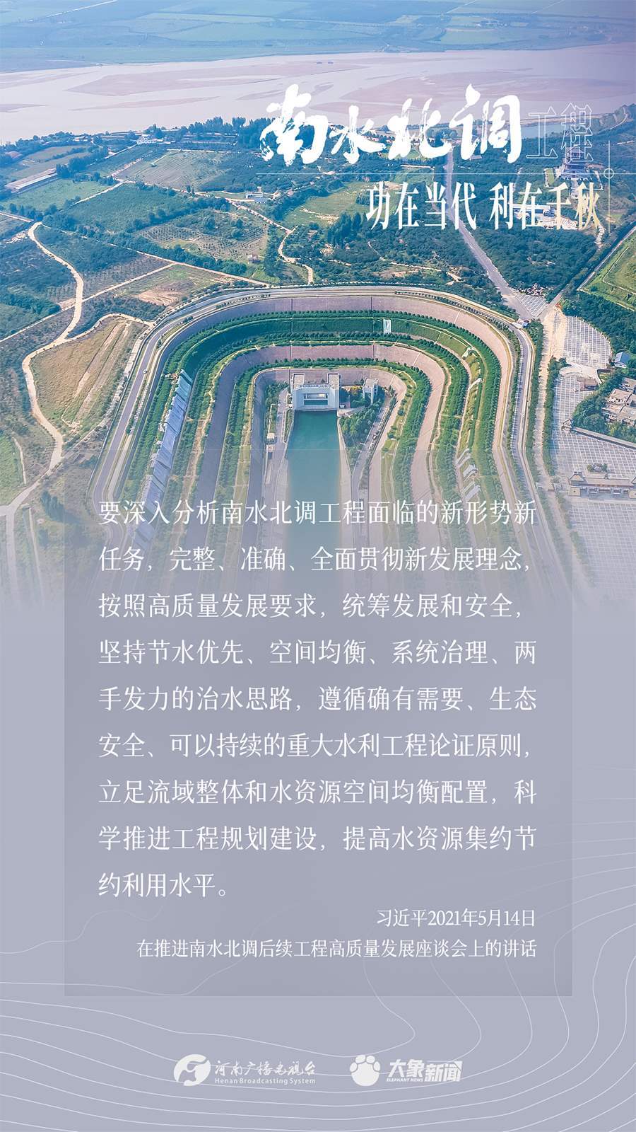 今年是南水北調(diào)東、中線一期工程通水10周年。南水北調(diào)工程事關(guān)戰(zhàn)略全局、事關(guān)長(zhǎng)遠(yuǎn)發(fā)展、事關(guān)人民福祉,一直是習(xí)近平總書記的牽掛。黨的十八大以來,總書記多次實(shí)地考察項(xiàng)目進(jìn)展、運(yùn)行,作出重要講話重要指示批示,為南水北調(diào)工程持續(xù)高質(zhì)量發(fā)展指明方向。