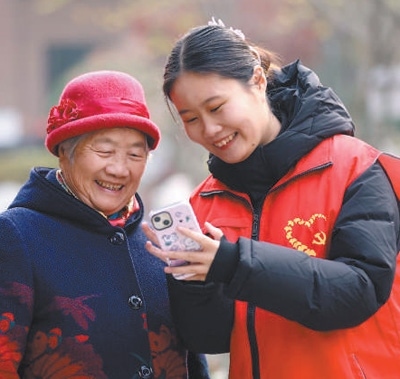 山東省臨沂市郯城縣郯城街道泉悅社區(qū)干部為老年居民介紹智能手機應用的使用方法。