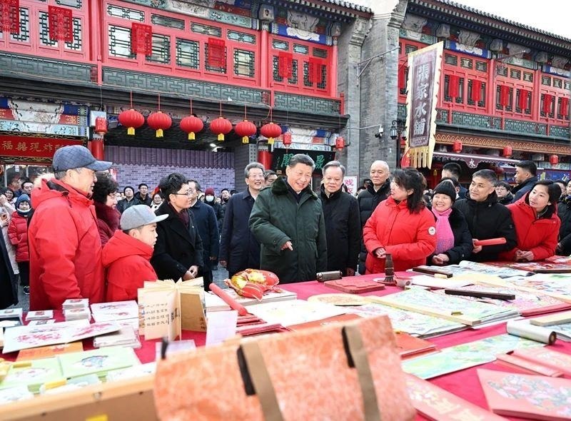 2024年春節(jié)前夕,總書(shū)記來(lái)到天津古文化街。在泥人張店鋪,他仔細(xì)觀看手藝人修復(fù)“孔子撫琴”的泥塑,感慨道:“一代代接續(xù)的工匠精神,讓文脈得以綿延不息。”在街邊的楊柳青木版年畫(huà)店鋪,他端詳“勾、刻、印、繪、裱”道道工藝,贊賞道“連年有余,寄托了人們對(duì)美好生活的向往”。