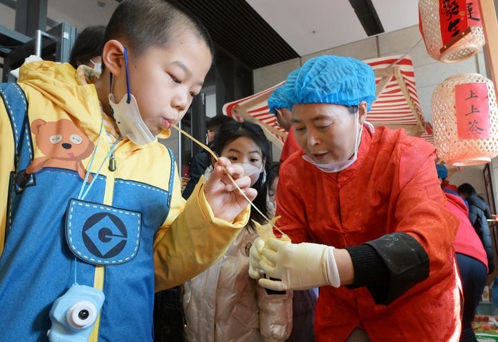 2025年1月29日,小朋友在位于北京的中國(guó)非物質(zhì)文化遺產(chǎn)館舉行的“過年——春節(jié)主題展”上體驗(yàn)“吹糖人”。新華社記者 李賀 攝