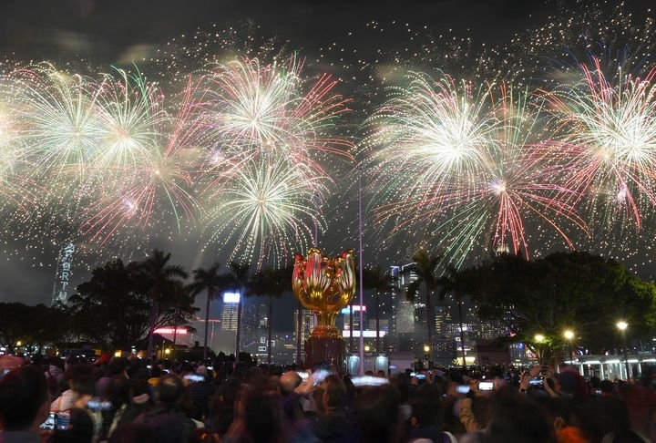 2025年1月30日,煙花在香港維多利亞港上空綻放,歡慶新春佳節(jié)。新華社記者 陳鐸 攝