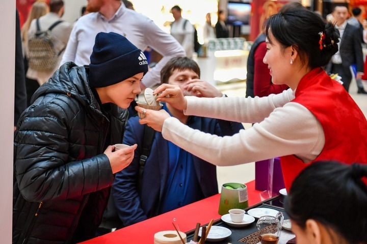 2025年1月28日,在俄羅斯莫斯科舉行的新春廟會(huì)活動(dòng)上,游客在感受茶文化。新華社記者 曹陽(yáng) 攝