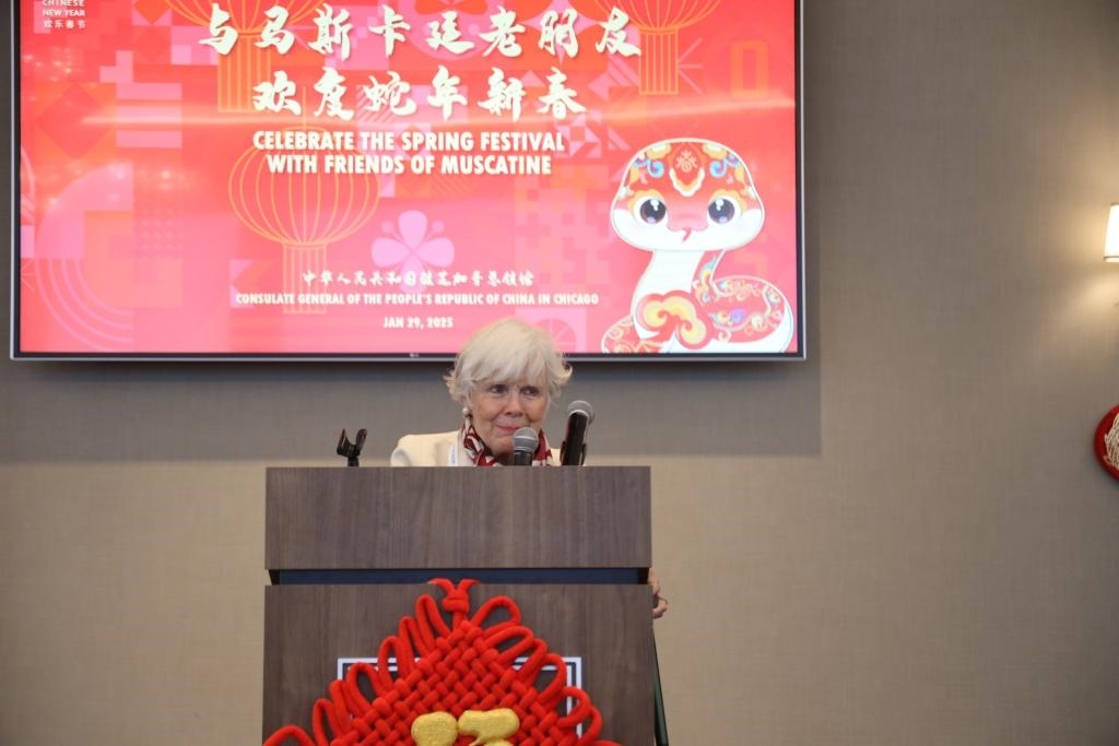 美國艾奧瓦州小城馬斯卡廷,當(dāng)?shù)貢r(shí)間農(nóng)歷蛇年初一。明媚陽光照耀下,在梅里爾酒店六層,一場特別的新春聚會(huì)正在舉行。福字、窗花、中國結(jié),“中國紅”裝點(diǎn)著喜慶祥和的氛圍。中美友人歡聚一堂,沉浸在歡聲笑語中。