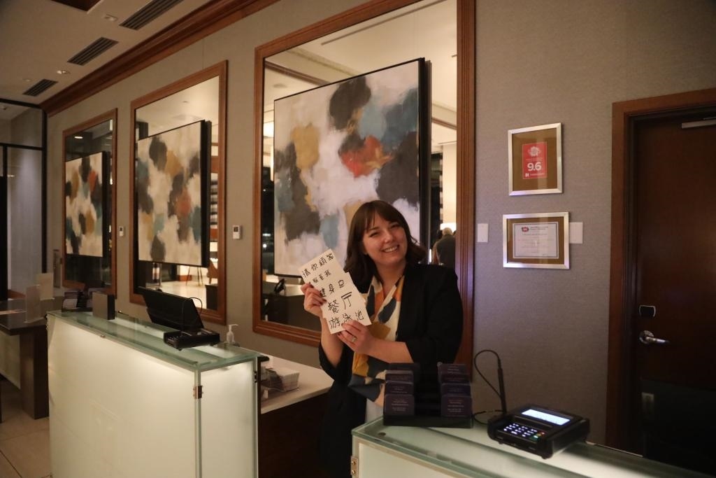 “請(qǐng)您稍等”“請(qǐng)聯(lián)系我”……在中國學(xué)生們?nèi)胱〉木频?,前臺(tái)工作人員謝伊·馬丁提前準(zhǔn)備了厚厚一疊中文指引卡片,讓很多第一次海外過年的中國小客人感到心里暖暖的。