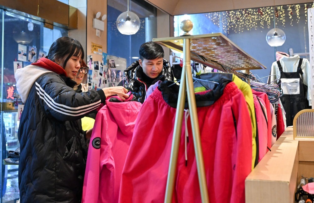 2025年1月23日,游客在湖北神農架林區(qū)木魚鎮(zhèn)街邊一家店鋪挑選雪具雪服。自然天成的地理環(huán)境造就豐富的冰雪資源,也給當?shù)剡\動裝備銷售、租賃行業(yè)帶來了商機。