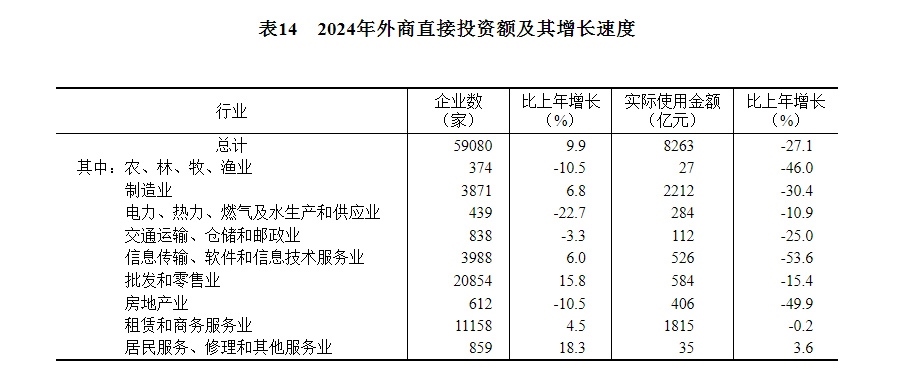 全年新設(shè)外商投資企業(yè)59080家,比上年增長(zhǎng)9.9%。實(shí)際使用外資8263億元,下降27.1%,折1162億美元,下降28.8%。其中,共建“一帶一路”國(guó)家(含通過部分自由港對(duì)華投資)對(duì)華新設(shè)外商投資企業(yè)17172家,增長(zhǎng)23.8%;對(duì)華直接投資1147億元,下降6.2%,折161億美元,下降8.4%。高技術(shù)產(chǎn)業(yè)實(shí)際使用外資2864億元,下降32.3%,折403億美元,下降34.0%。