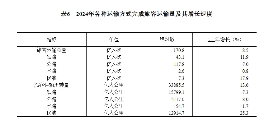 [29]自2024年1月起,公路旅客運(yùn)輸量、公路旅客運(yùn)輸周轉(zhuǎn)量統(tǒng)計(jì)口徑進(jìn)行了調(diào)整,將班車包車客運(yùn)量、公共汽電車城際城鄉(xiāng)客運(yùn)量、出租汽車(含巡游出租汽車、網(wǎng)絡(luò)預(yù)約出租汽車)城際城鄉(xiāng)客運(yùn)量納入公路旅客運(yùn)輸量統(tǒng)計(jì),公路旅客運(yùn)輸周轉(zhuǎn)量統(tǒng)計(jì)口徑相應(yīng)調(diào)整。2024年旅客運(yùn)輸總量、旅客運(yùn)輸周轉(zhuǎn)量、公路旅客運(yùn)輸量、公路旅客運(yùn)輸周轉(zhuǎn)量增速按可比口徑計(jì)算。