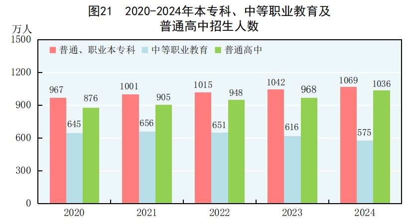 全年研究生教育招生135.7萬人,在學(xué)研究生409.5萬人,畢業(yè)生108.4萬人。普通、職業(yè)本??芠74]招生1068.9萬人,在校生3891.3萬人,畢業(yè)生1059.4萬人。中等職業(yè)教育[75]招生575.4萬人,在校生1659.4萬人,畢業(yè)生542.2萬人。普通高中招生1036.2萬人,在校生2922.3萬人,畢業(yè)生891.0萬人。初中招生1848.8萬人,在校生5386.2萬人,畢業(yè)生1698.2萬人。普通小學(xué)招生1616.6萬人,在校生10584.4萬人,畢業(yè)生1857.3萬人。特殊教育招生15.8萬人,在校生91.6萬人,畢業(yè)生17.7萬人。學(xué)前教育在園幼兒3584.0萬人。九年義務(wù)教育鞏固率為95.9%,高中階段毛入學(xué)率為92.0%。