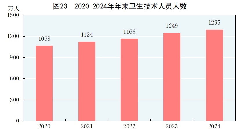 年末全國(guó)共有醫(yī)療衛(wèi)生機(jī)構(gòu)109.2萬個(gè),其中醫(yī)院3.9萬個(gè),在醫(yī)院中有公立醫(yī)院1.2萬個(gè),民營(yíng)醫(yī)院2.7萬個(gè);基層醫(yī)療衛(wèi)生機(jī)構(gòu)104.0萬個(gè),其中鄉(xiāng)鎮(zhèn)衛(wèi)生院3.3萬個(gè),社區(qū)衛(wèi)生服務(wù)中心(站)3.7萬個(gè),門診部(所)39.8萬個(gè),村衛(wèi)生室57.1萬個(gè);專業(yè)公共衛(wèi)生機(jī)構(gòu)9217個(gè)(不含衛(wèi)生監(jiān)督所、中心),其中疾病預(yù)防控制中心3429個(gè)。衛(wèi)生技術(shù)人員1295萬人,其中執(zhí)業(yè)醫(yī)師和執(zhí)業(yè)助理醫(yī)師505萬人,注冊(cè)護(hù)士584萬人。醫(yī)療衛(wèi)生機(jī)構(gòu)床位1037萬張,其中醫(yī)院818萬張,鄉(xiāng)鎮(zhèn)衛(wèi)生院151萬張。全年總診療人次[79]101.1億人次,出院人次[80]3.1億人次。