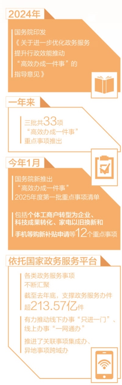 政府工作報告提出,“健全‘高效辦成一件事’重點事項清單管理和常態(tài)化推進(jìn)機(jī)制,完善覆蓋全國的一體化在線政務(wù)服務(wù)平臺。”