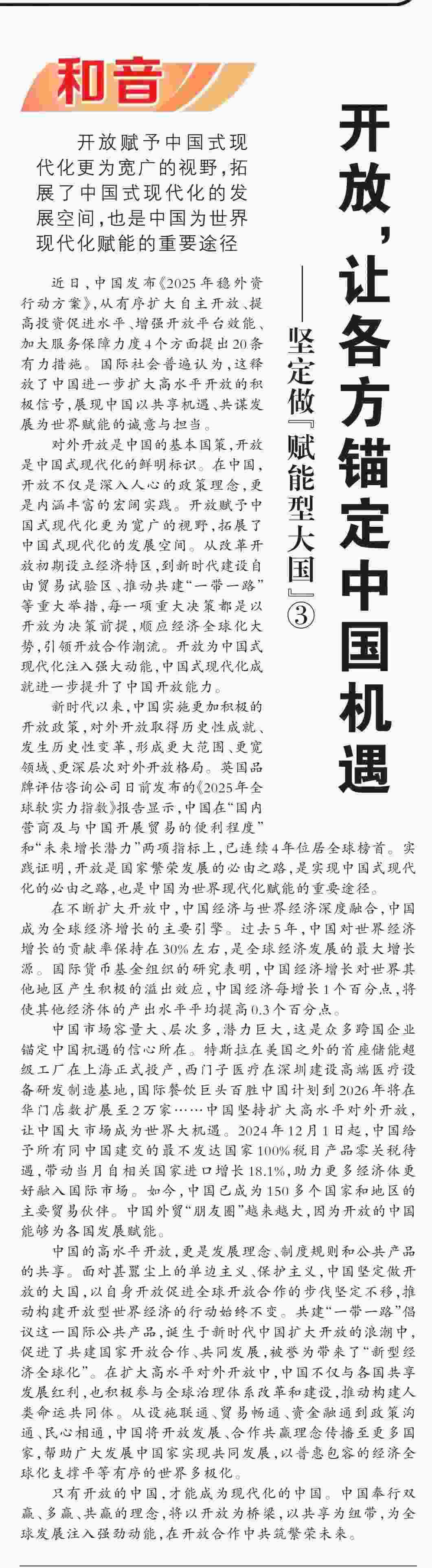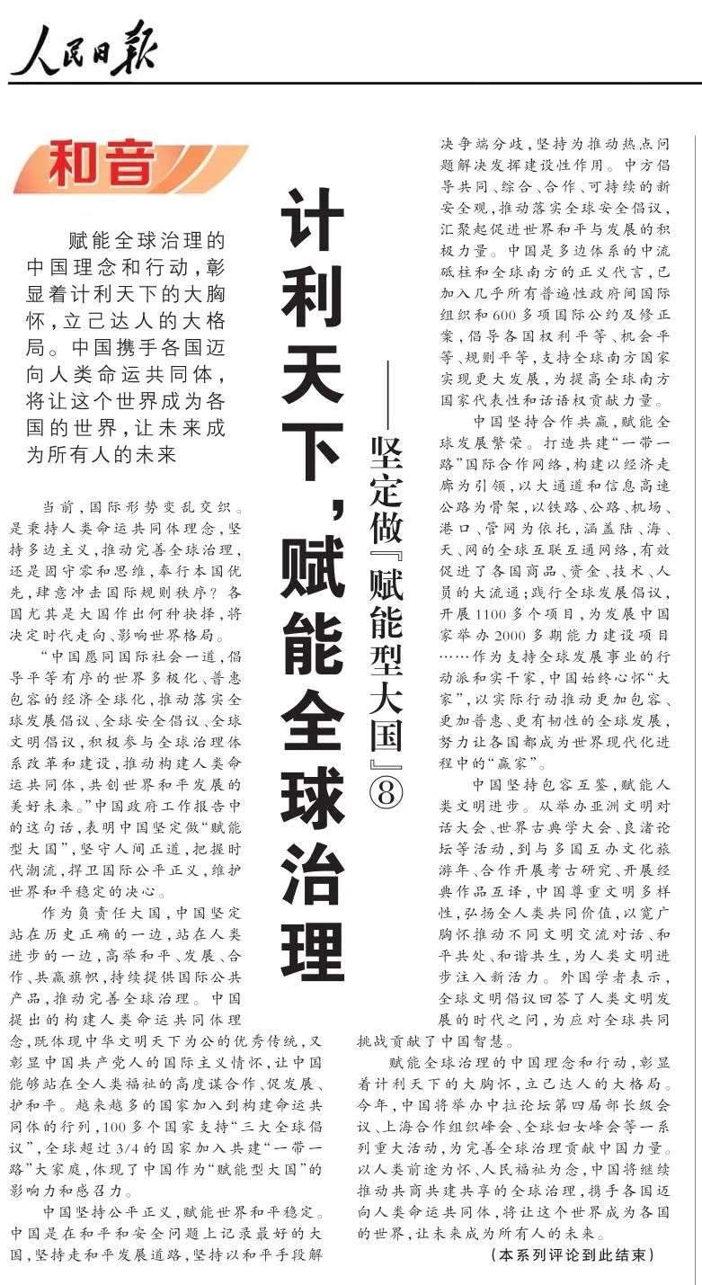 近期,《人民日?qǐng)?bào)》“和音”欄目推出“堅(jiān)定做‘賦能型大國(guó)’”系列評(píng)論,圍繞科技創(chuàng)新、開放共贏、綠色轉(zhuǎn)型、高質(zhì)量共建“一帶一路”、多邊治理等熱點(diǎn)議題,從不同角度闡釋中國(guó)何以成為一個(gè)“賦能型大國(guó)”的深層邏輯,展現(xiàn)中國(guó)始終秉持構(gòu)建人類命運(yùn)共同體理念,不斷以中國(guó)式現(xiàn)代化為世界現(xiàn)代化賦能的大國(guó)擔(dān)當(dāng)。