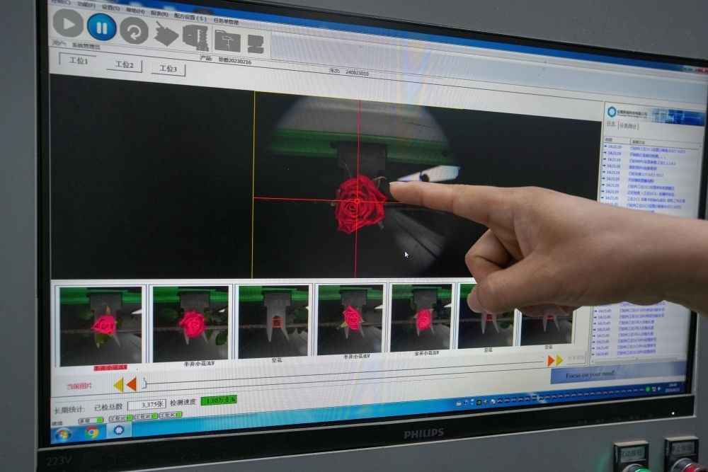 2024年8月23日,在云南晉寧花卉產(chǎn)業(yè)現(xiàn)代化示范園采后處理中心,計算機(jī)在實時監(jiān)測自動分揀流水線上的鮮切花。