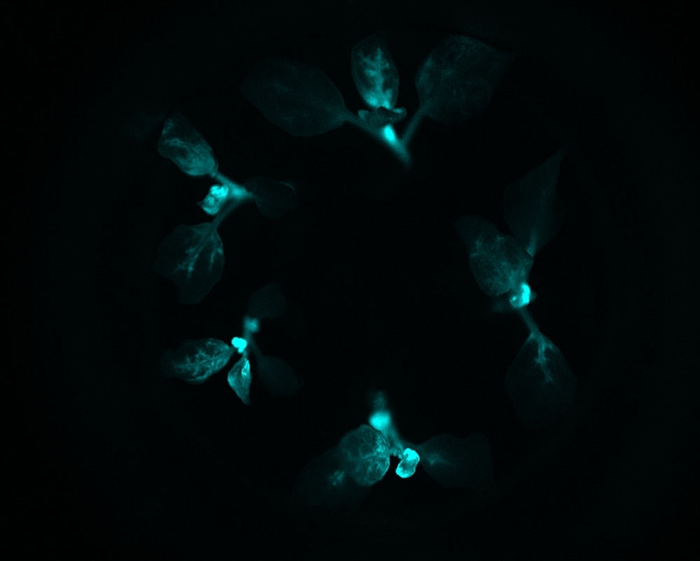 這是云南某農(nóng)業(yè)研發(fā)團(tuán)隊利用基因技術(shù)成功培育出肉眼可見的“自發(fā)光植物”在黑暗條件下發(fā)光(2017年6月21日攝)。