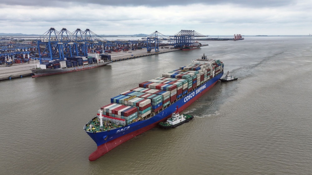 2024年5月19日,一艘海輪在廣西欽州港碼頭靠泊(無人機(jī)照片)。欽州港是北部灣港的組成部分,也是中國西南地區(qū)通往東盟的重要出???。西部陸海新通道利用鐵路、公路、水運(yùn)等多種運(yùn)輸方式,由重慶一路向南,經(jīng)廣西北部灣出海通達(dá)世界各地。截至2025年1月1日,北部灣港總航線達(dá)80條,其中外貿(mào)航線49條,基本實(shí)現(xiàn)國內(nèi)主要港口和東南亞、東北亞主要港口全覆蓋。